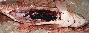 -Dấu hiệu bên ngoài: + Da có màu tối sẫm, cá nổi lờ đờ trên tầng mặt. Mang nhợt nhạt, nắp mang và vây xuất huyết. Mắt lồi và xuất huyết.